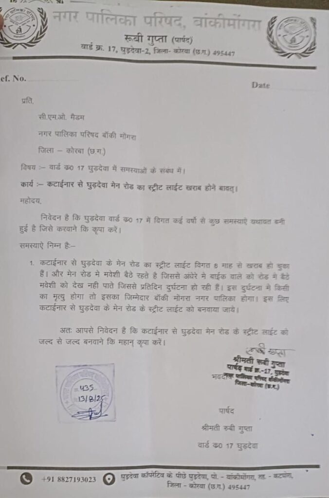 बांकीमोंगरा -: नगर पालिका परिषद बांकीमोंगरा अन्तर्गत वार्ड क्रमांक 17 घुड़देवा में विभिन्न समस्या बनी हुई है जिसमें एक समस्या शामिल हैं स्ट्रीट लाइट की । पिछले कुछ माह से कटाईनार से घुड़देवा मेन रोड़ में स्थित लगे खम्भे का स्ट्रीट लाइट बंद पड़ी हुई । जिसके लिए वार्ड क्रमांक 17 घुड़देवा -2 पार्षद श्रीमती रुबी पवन गुप्ता ने पालिका को पत्र देकर ध्यानाकर्षण कराते हुए बताया कि मेन रोड में मवेशी बैठे रहते हैं । जिससे अंधेरे में बाईक चालकों को रोड़ में बैठे मवेशी को देख नहीं पाते जिससे प्रतिदिन दुर्घटना हो रही है , इस तरह की दुर्घटना में किसी का मृत्यु हो सकता है । इसका जिम्मेदार बांकीमोंगरा नगर पालिका होने की बात कही है , वहीं पार्षद श्रीमती रुबी पवन गुप्ता ने पत्र के माध्यम से निवेदन किया है कि जल्द से बंद पड़े स्ट्रीट लाइट पुनः बनाया जाए । ताकि समय रहते होने वाले दुर्घटनाओं से बच सके और लोगों को उजाला मिल सके।