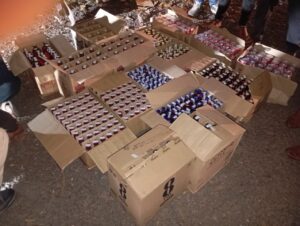 वाहन की तलाशी लेने पर उसमें रखे 16 खाखी रंग के कार्टन से विभिन्न ब्रांड की अंग्रेजी शराब बरामद की गई, जिसमें —