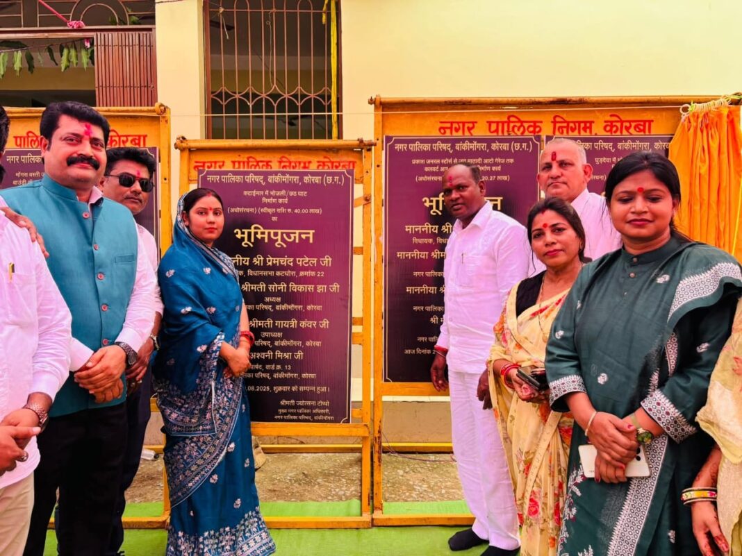 बाँकी मोंगरा (विनोद साहू की रिपोर्ट)-: बाँकी मोंगरा नगर पालिका परिषद एवं छत्तीसगढ़ शासन में कटघोरा विधानसभा के लोकप्रिय विधायक माननीय प्रेमचंद पटेल जी एवं नगर पालिका परिषद बाँकी मोंगरा अध्यक्ष श्रीमती सोनी विकास झा जी के द्वारा आज विकास की राह में 1 करोड़ 30 लाख के कार्यों का भूमिपूजन किया गया जिसमें कटाईनार छठ घाट, घुडदेवा छठ घाट, मोंगरा मुक्तिधाम, बांकी चौक मुख्य मार्ग में नाली निर्माण कार्य का भूमिपूजन किया गया । इस अवसर पर मुख्य रूप से प्रदेश कोषाध्यक्ष भाजपा युवा मोर्चा छत्तीसगढ़ विकास झा जी, नेता प्रतिपक्ष मधुसूदन दास एवं पार्षद गण के गौरव पूर्ण उपस्थिति में अनेक विकास कार्यों का भूमि पूजन व स्वागत कार्यक्रम आयोजित किया गया है।