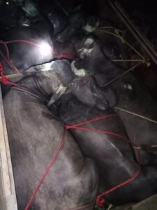 रास्ते में रिवर्स होकर चालक तेजी से खालबहरा आंगनबाड़ी के पास दीवार किनारे सटा दिया एवं पीकप से उतरकर चालक अंधेरे में भाग गया तब तक पुलिस स्टाफ उप निरी. अमरलाल यादव के साथ, प्र.आर.07 बलराम पैकरा, आर.288 विजय टाटू आ गये जो सभी मिलकर पीकप चालक की तलाश किये जो नही मिला पीकप चेक किये तो एक सफेद रंग की पीकप जिसका रजि. नं. MP19ZL5329 की बोलेरो पीकप मैक्स वाहन जिसमें क्षमता से अधिक मवैशी भैंसा एवं भैंस क्रूरता पूर्वक सींग से पैर वांध कर उपर से रस्सी से कसकर सटाकर बांधे हुये पाये गये जो क्रुरता पूर्वक रस्सी सें बंधे हुये ठुंस-ठुंस कर भरे हुये थे जिनको हिलने डुलनें व सांस लेने में बहुत तकलीफ होने कारण । यह कृत्य पृथम दृष्टया धारा 11 घ पशु क्रुरता अधिनियम का अपराध पाये जाने से 05 नग भैंसा जिनका हुलिया रंग काला घुमावदार सींग जवान तगड़े कृषि योग्य कीमती 25000/- रू की दर से 125000/- रू के एवं एक नग भैंसा दुवला दो दांत काले रंग का माथे पर चंदुला सफेद है किमती 15000/- रू का एवं एक नग काली रंग की जवान भैंस जिसकी सींग घुमावदार गोल मुर्रा जेसे कीमती 30000/- रू की वोलेरा पीकप कीमती 400000/- रू की कुल मवैशी 07 नग कीमती 170000/- की मौके पर समक्ष उपरोक्त गवाहन के मताबिक जप्ति पत्रक के जप्त किया गया वापसी पर अज्ञात आरोपी वाहन क्र. MP19ZL5329 वोलेरो पीकप के चालक के विरूद्ध अपराध 0/25 धारा 11घ पशु क्रूरता अधि. 1960 एवं 52/192,39/192 MV ACT का पंजीबद्ध कर विवेचना में लिया गया ।