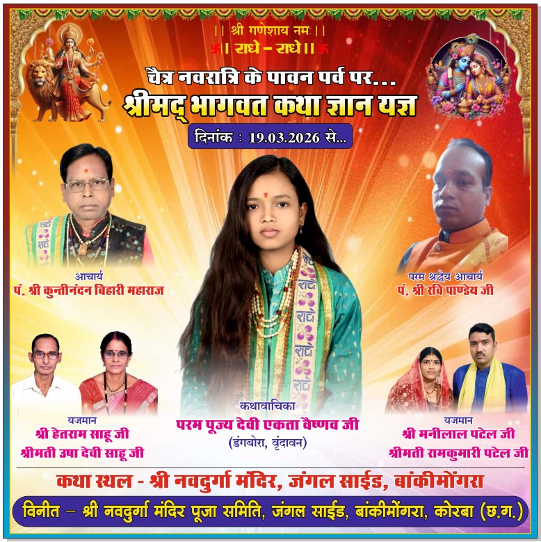 शुभ संकेत/बाकी मोगरा:-बाकी मोगरा जंगल साइड स्थित नव दुर्गा समिति द्वारा चैत्र नवरात्रि के पावन अवसर पर नौ दिवसीय ‘भागवत कथा एवं कथा वाचिका परम पूज्य देवी एकता वैष्णो जी (डंगबोरा वृंदावन ) के भव्य धार्मिक कार्यक्रम का आयोजन किया जा रहा है। आयोजन के प्रथम दिन आज भक्ति और उत्साह के साथ विशाल कलश यात्रा निकाली गई।