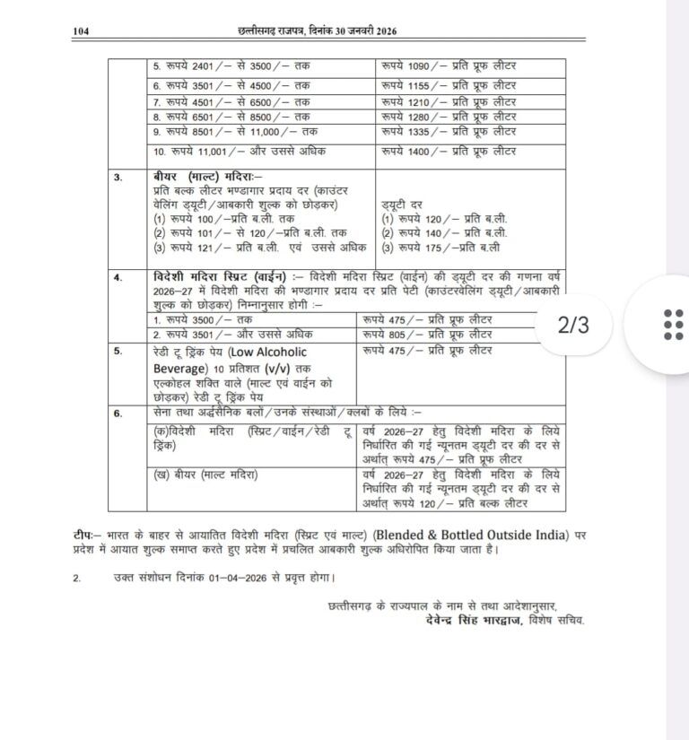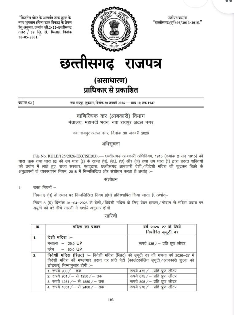 नई ड्यूटी दरों को छत्तीसगढ़ के राजपत्र में प्रकाशित कर दिया गया है, जिससे यह साफ है कि आने वाले दिनों में शराब की कीमतों में बदलाव आम उपभोक्ताओं पर असर डाल सकता है।