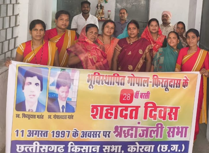 कोरबा (विनोद साहू की रिपोर्ट ) -: ग्राम नराइबोध गोलीकांड की 28 वी बरसी के अवसर पर 11 अगस्त को भूविस्थापित एकजुटता दिवस का आयोजन करते हुए किसान सभा ने नरईबोध में गोपाल- फिरतू दास के नाम से संचालित स्कूल में गोपाल एवं फिरतु दास को श्रद्धांजलि अर्पित करते हुए रोजगार और बसावट की मांग को लेकर संघर्ष तेज करने का संकल्प लिया इस अवसर पर प्रमुख रूप से शहीद गोपाल दास की पत्नी बृंदा बाई ओर उनके पुत्र रमेश दास प्रमुख रूप से उपस्थित थे।