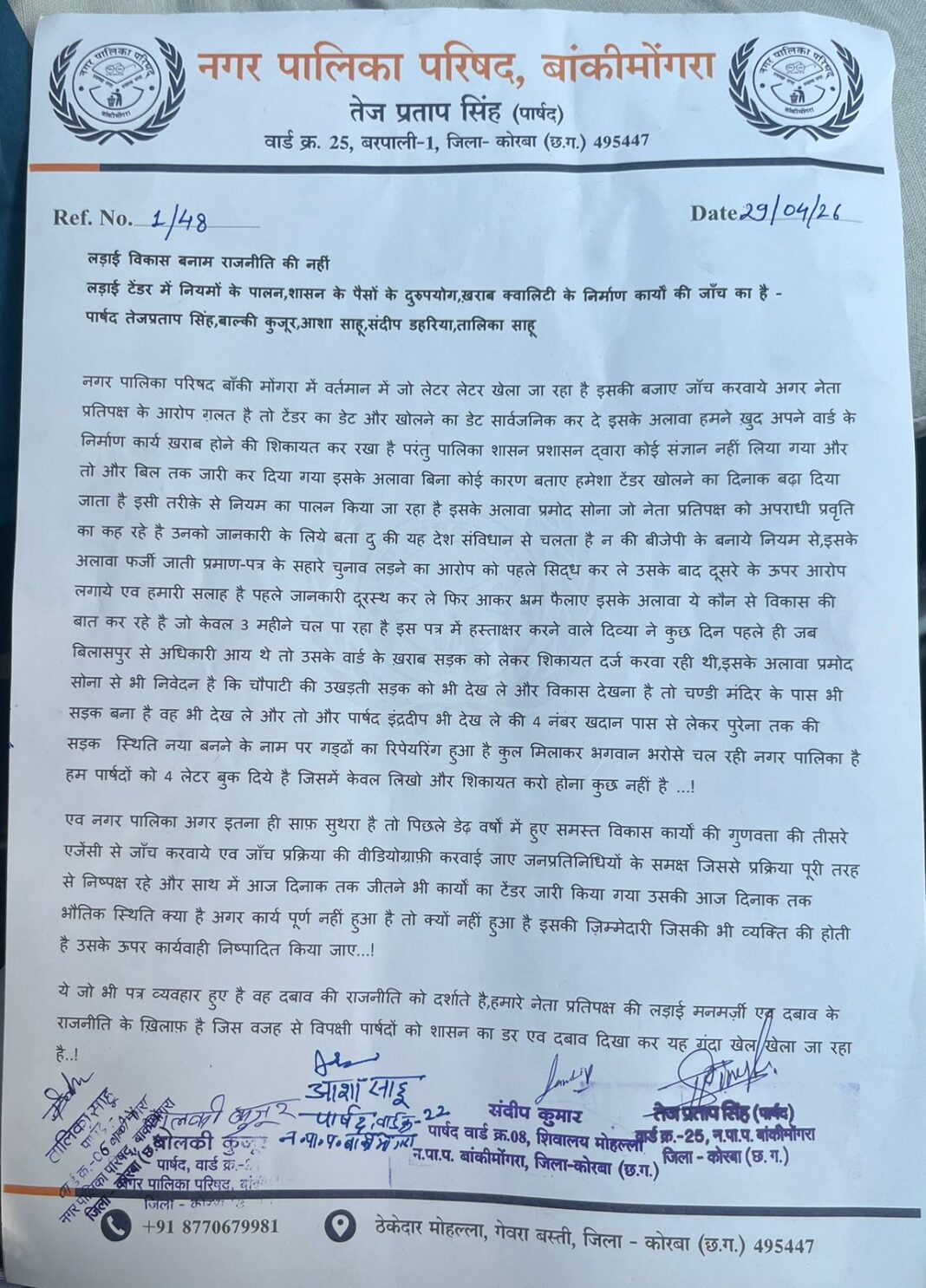बाकी मोगरा -: नगर पालिका परिषद बाँकी मोंगरा में वर्तमान में जो लेटर खेला जा रहा है इसकी बजाए जॉच करवाये अगर नेता प्रतिपक्ष के आरोप ग़लत है तो टेंडर का डेट और खोलने का डेट सार्वजनिक कर दे इसके अलावा हमने ख़ुद अपने वार्ड के निर्माण कार्य ख़राब होने की शिकायत कर रखा है परंतु पालिका शासन प्रशासन द्वारा कोई संज्ञान नहीं लिया गया और तो और बिल तक जारी कर दिया गया इसके अलावा बिना कोई कारण बताए हमेशा टेंडर खोलने का दिनाक बढ़ा दिया जाता है इसी तरीक़े से नियम का पालन किया जा रहा है इसके अलावा प्रमोद सोना जो नेता प्रतिपक्ष को अपराधी प्रवृति का कह रहे है उनको जानकारी के लिये बता दु की यह देश संविधान से चलता है न की बीजेपी के बनाये नियम से,इसके अलावा फर्जी जाती प्रमाण-पत्र के सहारे चुनाव लड़ने का आरोप को पहले सिद्ध कर ले उसके बाद दूसरे के ऊपर आरोप लगाये एव हमारी सलाह है पहले जानकारी दूरस्थ कर ले फिर आकर भ्रम फैलाए इसके अलावा ये कौन से विकास की बात कर रहे है जो केवल 3 महीने चल पा रहा है इस पत्र में हस्ताक्षर करने वाले दिव्या ने कुछ दिन पहले ही जब बिलासपुर से अधिकारी आय थे तो उसके वार्ड के ख़राब सड़क को लेकर शिकायत दर्ज करवा रही थी,इसके अलावा प्रमोद सोना से भी निवेदन है कि चौपाटी की उखड़ती सड़क को भी देख ले और विकास देखना है तो चण्डी मंदिर के पास भी सड़क बना है वह भी देख ले और तो और पार्षद इंद्रदीप भी देख ले की 4 नंबर खदान पास से लेकर पुरेना तक की सड़क स्थिति नया बनने के नाम पर गड्ढों का रिपेयरिंग हुआ है कुल मिलाकर भगवान भरोसे चल रही नगर पालिका है हम पार्षदों को 4 लेटर बुक दिये है जिसमें केवल लिखो और शिकायत करो होना कुछ नहीं है।