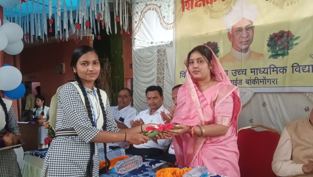 बांकीमोंगरा -: दिनांक 5 सितंबर को भारत के पूर्व राष्ट्रपति सर्वपल्ली राधाकृष्णन का जन्मदिवस के अवसर पर भारत भर में शिक्षक दिवस मनाया जाता है। इसी कड़ी में जिले के नगर पालिका परिषद बांकीमोंगरा में भी हर्षोल्लास के साथ शिक्षक दिवस मनाया गया वहीं 5 सितंबर को ज्ञानोदय उच्चतर माध्यमिक विद्यालय जंगल साईड ( बांकीमोंगरा ) में धूमधाम से शिक्षक दिवस मनाया गया। जहां कार्यक्रम में मुख्य अतिथि के रुप में नगर पालिका परिषद बांकीमोंगरा के अध्यक्ष श्रीमती सोनी कुमारी झा , विशिष्ट अतिथि भाजयुमो छत्तीसगढ़ प्रदेश कोषाध्यक्ष विकास झा , कार्यक्रम के अध्यक्षता डॉ. जे.पी चंद्रा , पूर्व मंडल महामंत्री अश्वनी साहु शामिल हुए।