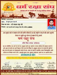 सक्ती – छत्तीसगढ़ धर्म रक्षा संघ में सक्ती जिले के नवनियुक्त जिला अध्यक्ष सुरेश चंद्रा को नियुक्त किया गया है धर्म रक्षक संघ के राष्ट्रीय अध्यक्ष श्री सौरभ गौड़ अनुमोदन और प्रदेश अध्यक्ष लखन लाल नायक की अनुशंसा पर यह नियुक्त की गई है प्रदेश अध्यक्ष लखन लाल नायक ने कहा कि सुरेश चंद्रा ने नैतिकता, संस्कृति और कर्तव्य की रक्षा और वही सनातन धर्म की रक्षा सामाजिक उद्भव और धार्मिक मूल्यों एवं सामाजिक उत्तरदायित्व का परिचय दिया है संगठन को विश्वास है कि वह अपनी नई जिम्मेदारी को निष्ठा और दक्षता से निभाएंगे। नियुक्ति पत्र में उसके उज्जवल भविष्य को कामना करते हुए कहा कि वह संगठन की नीति और उद्देश्यों के प्रति अपने जिम्मेदारियां को पूरी निष्ठा के साथ निभाकर संगठन को और मजबूत करेंगे।