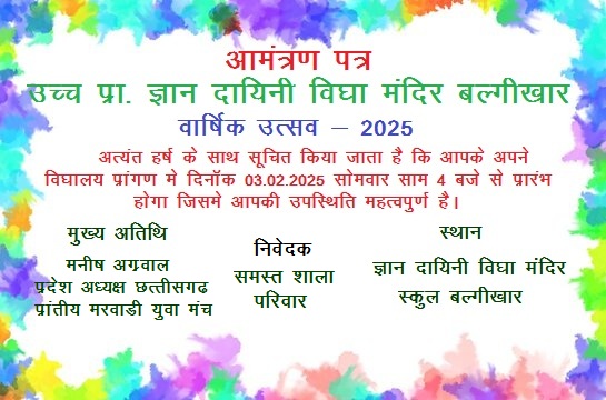 कोरबा/शुभ संकेत: आजकल इस आधुनिक विज्ञान के युग में प्रत्येक विद्यालयों में पढ़ाई के साथ-साथ बच्चों में छिपी कला और प्रतिभा को भी निखारने का कार्य किया जा रहा है। ताकि बच्चें इस प्रतियोगिता के युग में प्रत्येक क्षेत्र में निपुण और सक्षम हो सके। इसी तारतम्य में जिले के उच्च प्राथमिक ज्ञान दायिनी विद्या मंदिर विद्यालय, बलगीखार में भी प्रत्येक वर्ष की भांति इस वर्ष भी सांस्कृतिक वार्षिक उत्सव कार्यक्रम का आयोजन दिनांक 03 फरवरी 2025, दिन सोमवार को शाम 4:00 बजे से किया गया है। जिसमें विद्यालय के सभी विद्यार्थी अपने प्रतिभा एवं रुचि के अनुसार अपने कला का प्रदर्शन करेंगे।