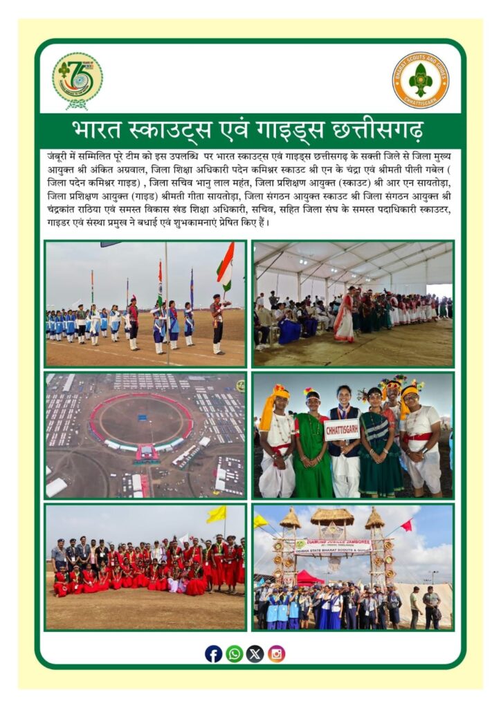 जंबूरी में सम्मिलित पूरे टीम को इस उपलब्धि पर भारत स्काउट्स एवं गाइड्स छत्तीसगढ़ के सक्ती जिले से जिला मुख्य आयुक्त श्री अंकित अग्रवाल, जिला शिक्षा अधिकारी पदेन कमिश्नर स्काउट श्री एन के चंद्रा एवं श्रीमती पीली गबेल (जिला पदेन कमिश्नर गाइड), जिला सचिव भानुलाल महंत, ज़िला सह सचिव श्रीमती लक्ष्मी महंत, जिला प्रशिक्षण आयुक्त (स्काउट) श्री आर. एन. सायतोड़ा, जिला प्रशिक्षण आयुक्त (गाइड) श्रीमती गीता सायतोड़ा, जिला संगठन आयुक्त स्काउट श्री जिला संगठन आयुक्त श्री चंद्रकांत राठिया, ज़िला मीडिया प्रभारी श्री कार्तिकराम यादव एवं समस्त विकासखंड शिक्षा अधिकारी, सचिव सहित जिला संघ के समस्त पदाधिकारी स्काउटर, गाइडर एवं संस्था प्रमुख ने बधाई एवं शुभकामनाएं प्रेषित किए हैं।