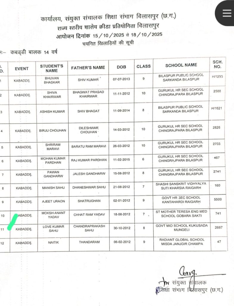 सक्ती/शुभ संकेत: संभाग स्तरीय कबड्डी प्रतियोगिता (आयु वर्ग U -14) में शानदार प्रदर्शन करते हुए संत मदर टेरेसा विद्यालय गोबरा, विकासखंड डभरा, जिला सक्ति के होनहार छात्र मोक्ष यादव कक्षा – 7वीं ने राज्य स्तरीय प्रतियोगिता में जगह बनाकर पूरे सक्ति जिले का नाम रोशन किया है।