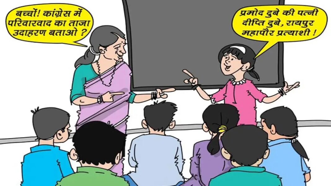 रायपुर। छत्तीसगढ़ में नगरीय निकाय चुनाव को लेकर सियासी घमासान तेज हो गया है। इस बीच भाजपा और कांग्रेस के बीच पोस्टर वार का सिलसिला लगातार जारी है। भाजपा ने एक कार्टून पोस्टर जारी कर कांग्रेस पर परिवारवाद का आरोप लगाते हुए कहा कि कांग्रेस परजीवी- प्रदेश का बच्चा-बच्चा जानता है, कांग्रेस परिवारवाद की मूर्ति है। इस पोस्टर में कांग्रेस के महापौर प्रत्याशी के परिवारवाद पर तंज कसा गया है।
