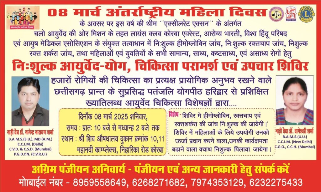 कोरबा/शुभ संकेत: दिनांक 8 मार्च को अंतर्राष्ट्रीय महिला दिवस के सुअवसर पर लायंस क्लब कोरबा एवरेस्ट, विश्व हिंदू परिषद और आयुष मेडिकल एसोसिएशन के संयुक्त तत्वाधान में एक नि:शुल्क स्वास्थ्य शिविर का आयोजन किया जा रहा है। इस शिविर में महिलाओं और युवतियों के लिए नि:शुल्क हीमोग्लोबिन जांच, रक्तचाप जांच, रक्त शर्करा जांच और आयुर्वेद-योग चिकित्सा परामर्श की सुविधा उपलब्ध कराई जाएगी।